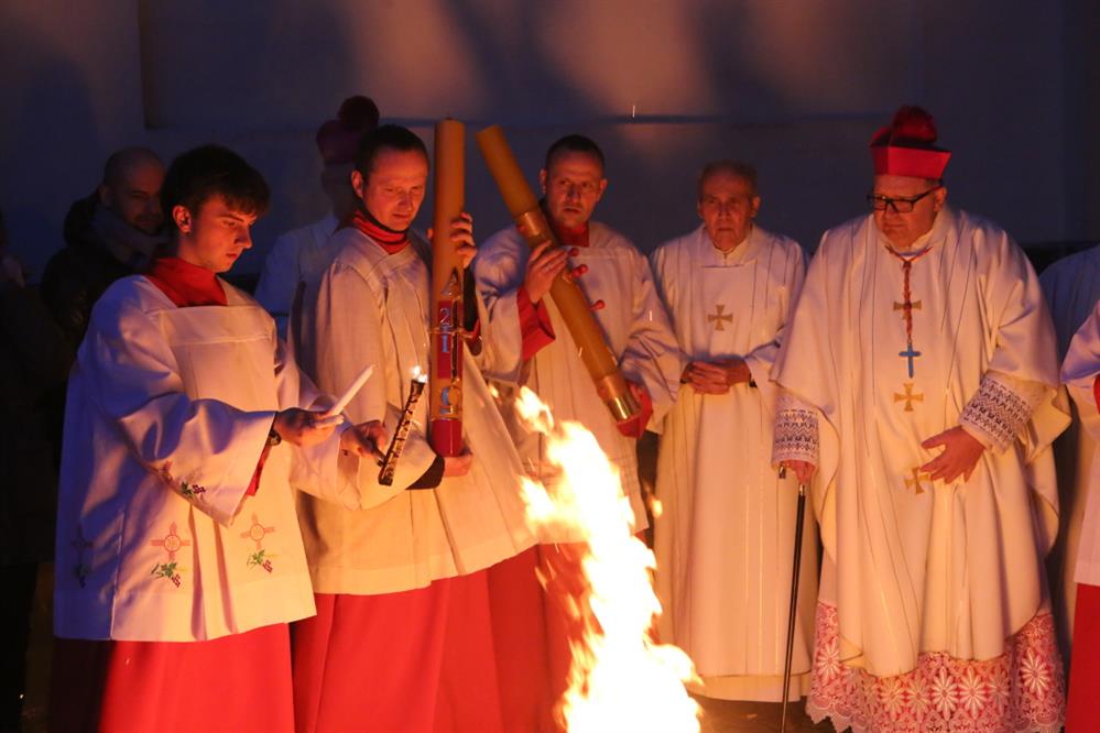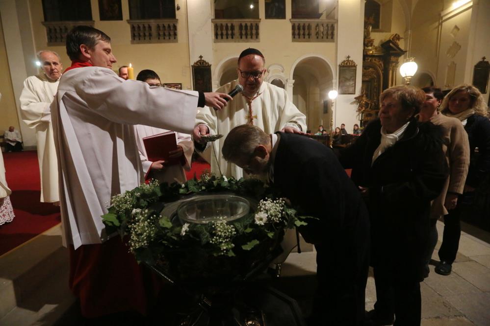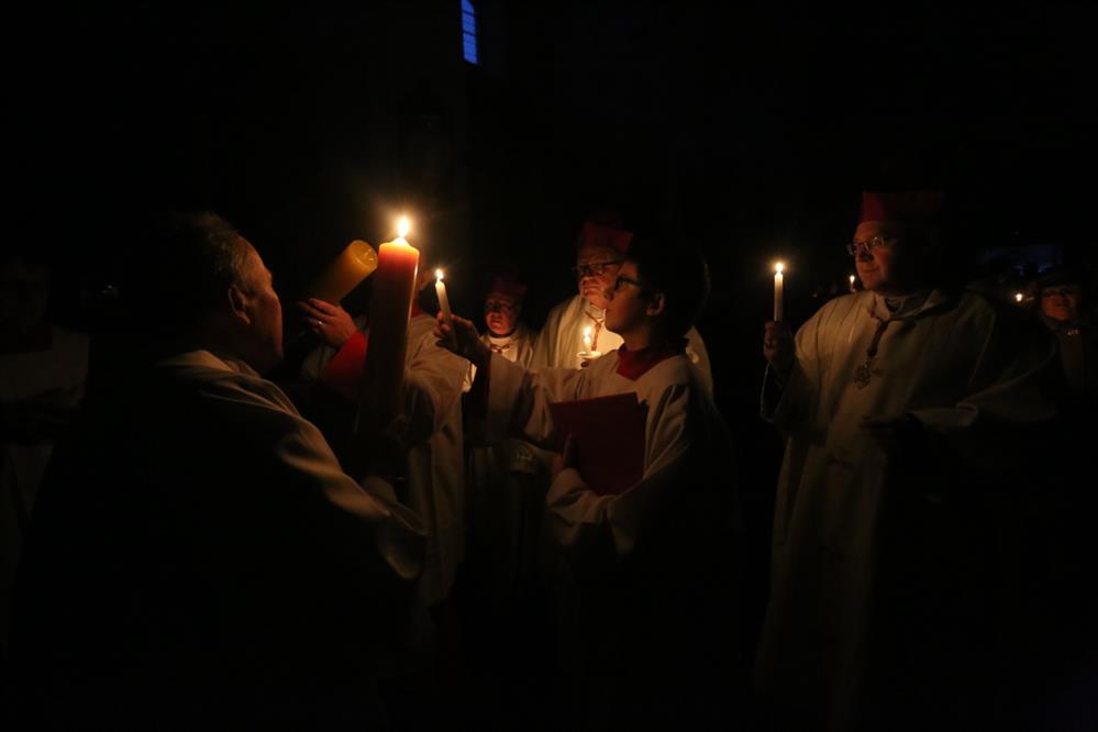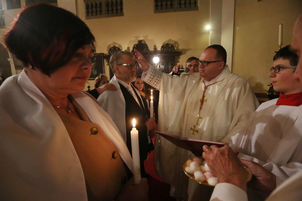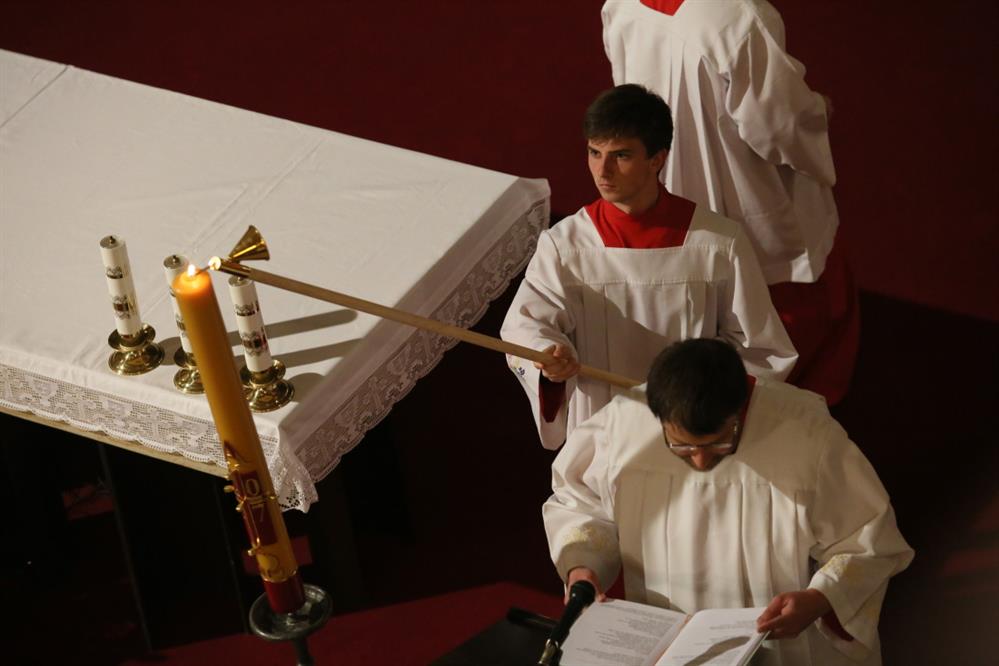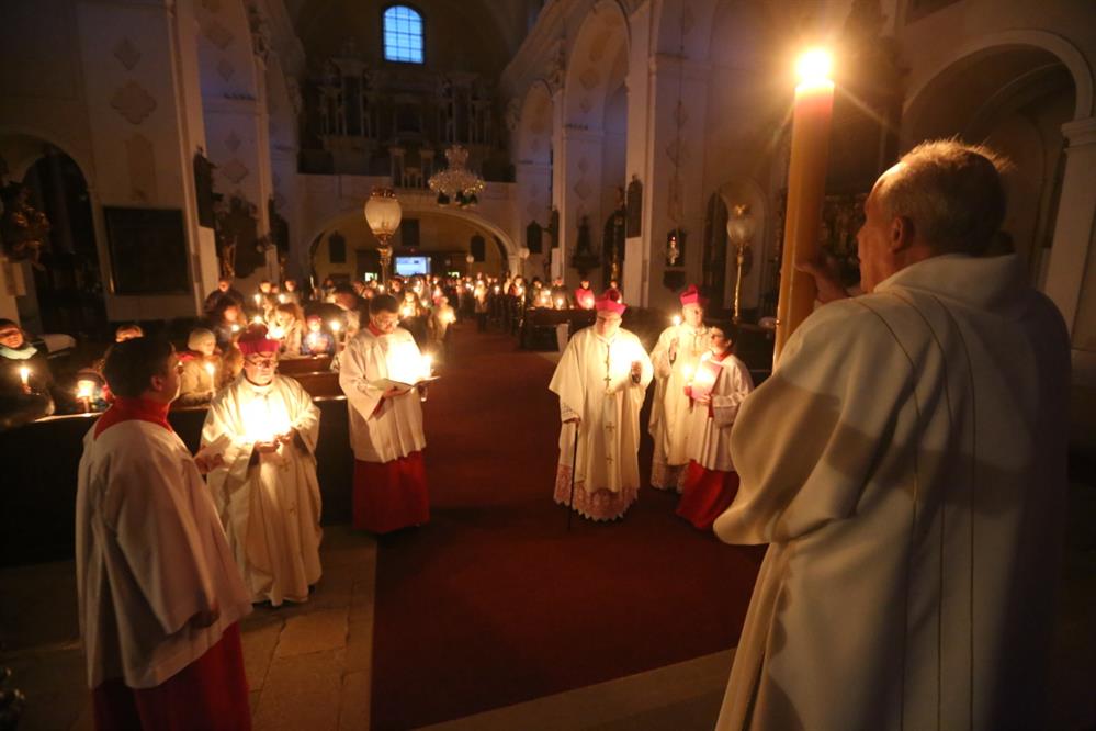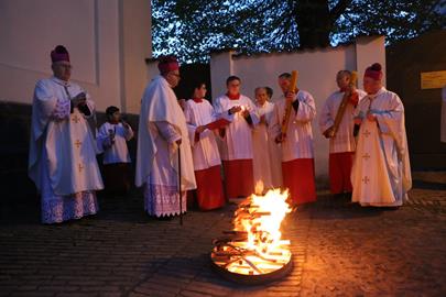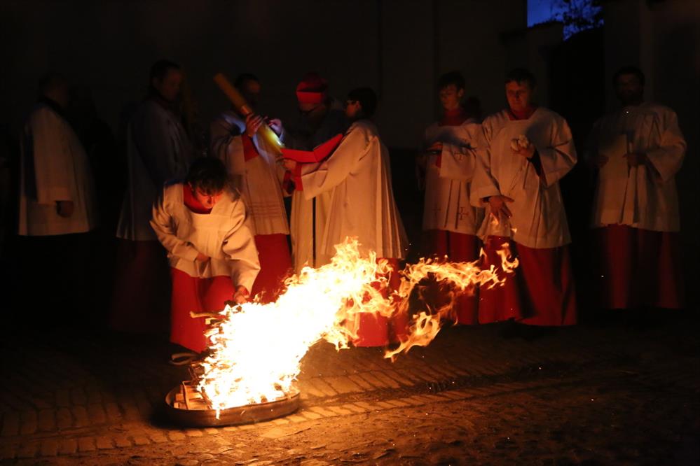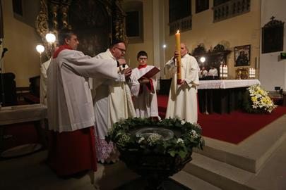 Bílá sobota, velikonoční vigilie (obřady velikonoční vigilie – slavnost světla, bohoslužba slova, vody a oběti) s proboštem litoměřické katedrální kapituly P. Jiřím Hladíkem O.Cr., generálním vikářem Mons. Martinem Davídkem a kapitulním kanovníkem a děkanem litoměřické městské farnosti R.D. Józefem Szeligou, 15. dubna 2017, katedrála sv. Štěpána, Litoměřice
