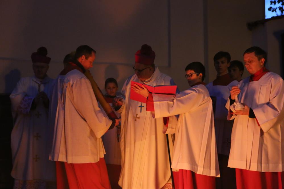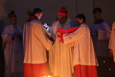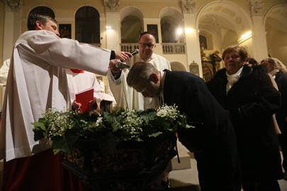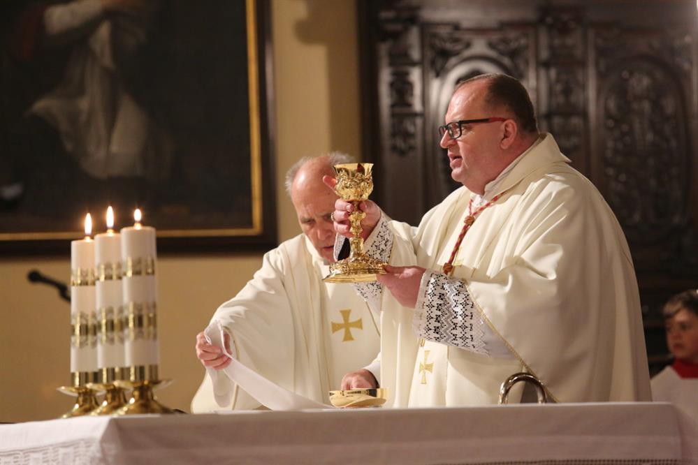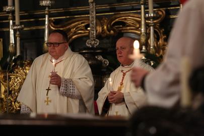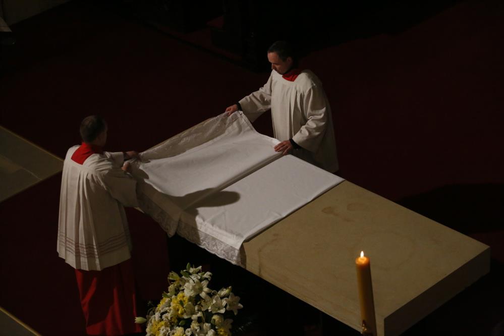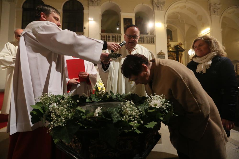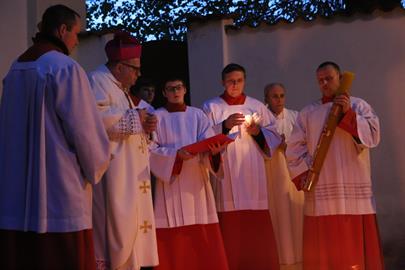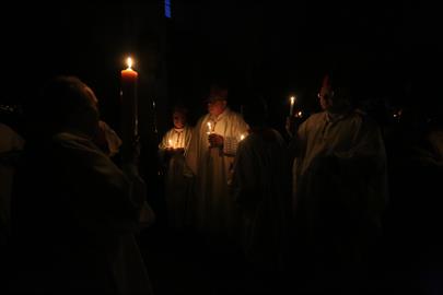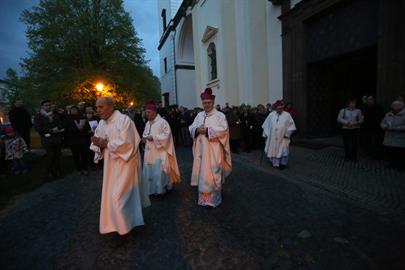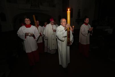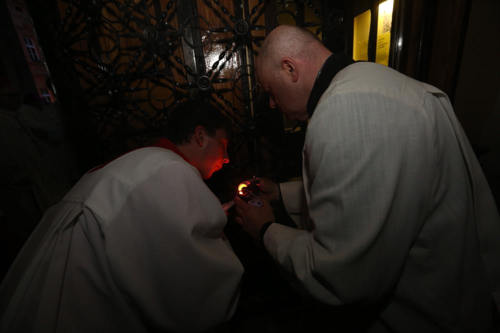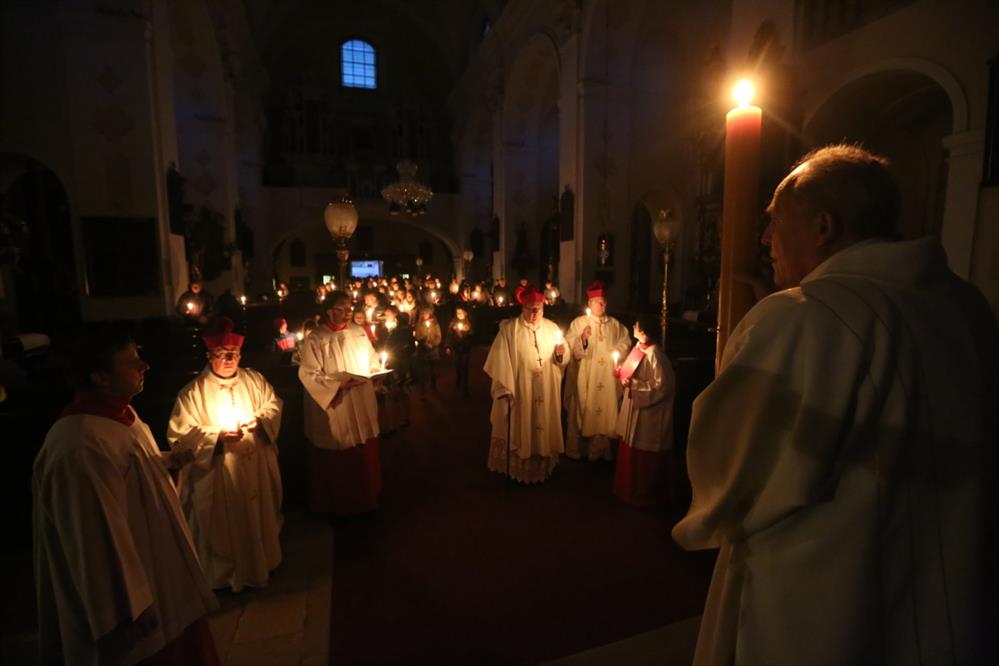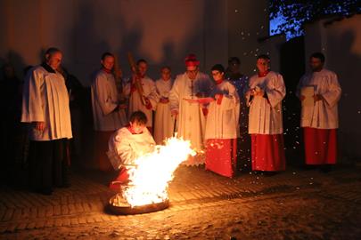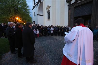 Bílá sobota, velikonoční vigilie (obřady velikonoční vigilie – slavnost světla, bohoslužba slova, vody a oběti) s proboštem litoměřické katedrální kapituly P. Jiřím Hladíkem O.Cr., generálním vikářem Mons. Martinem Davídkem a kapitulním kanovníkem a děkanem litoměřické městské farnosti R.D. Józefem Szeligou, 15. dubna 2017, katedrála sv. Štěpána, Litoměřice