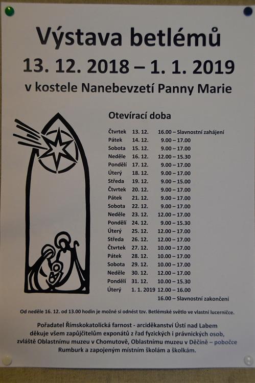 V arciděkanském kostele Nanebevzetí Panny Marie v Ústí nad Labem se koná již 32. rokem tradiční výstava betlémů, kam zapůjčili své exponáty fyzické i právnické osoby, kostely litoměřické diecéze a zapojily se také školy a školky.