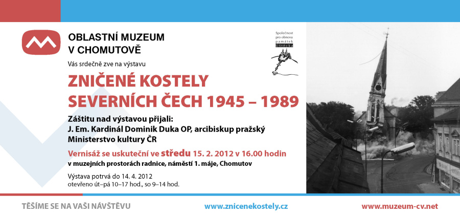Ve středu 15. února 2012 proběhne v muzejních prostorách radnice v Chomutově slavnostní vernisáž výstavy „Zničené kostely severních Čech 1945–1989“.