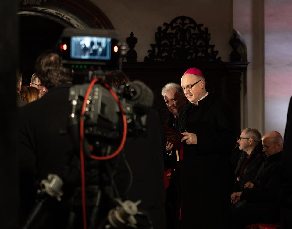 Přenosové vozy a štáb čítající téměř čtyřicet lidí připravoval na Nový rok techniku a chrám už od dopoledne. Zázemí jim připravil místní duchovní správce a premonstrátský řeholník Pius Zdeněk Vágner.