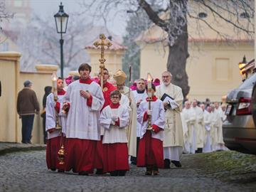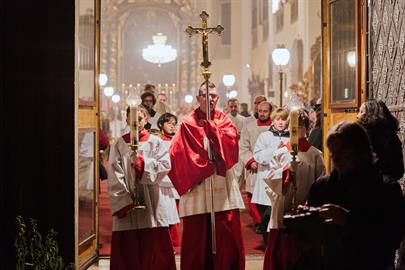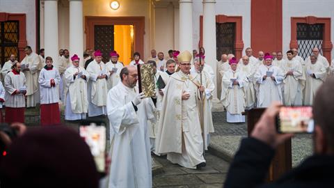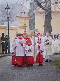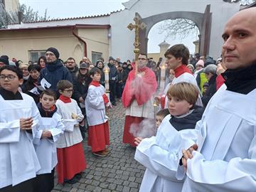 V čele nesli ministranti tzv. Jubilejní kříž, který bude v katedrále vystavený k uctění po celý rok. "Je to barokní zlatý procesní kříž ze 17. století, který se používal v katedrále sv. Štěpána a našli jsme ho v depozitáři a nechali pro tento účel zrenovovat," prozradil katedrální kostelník Antonín Fegyverés.