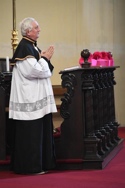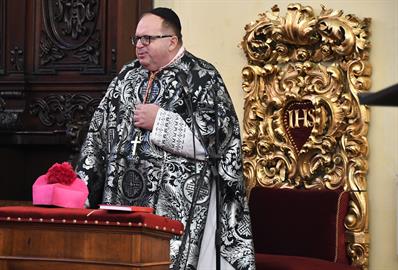 Hladík při promluvě. Poté, kdy se kanovníci (členové kapituly) pomodlili za své