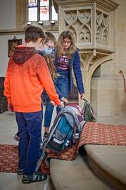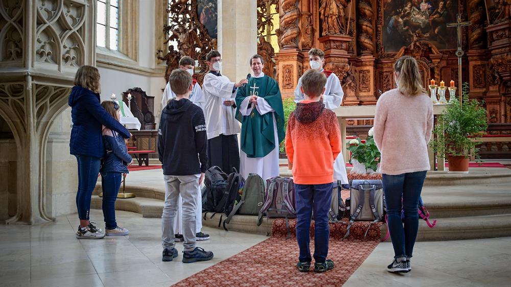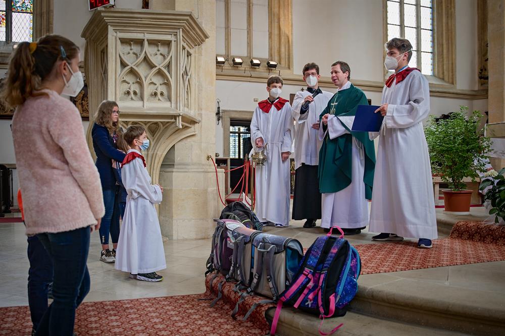 Machek žehná školní brašny a školní potřeby dětí z farnosti a vyprošuje spolu s