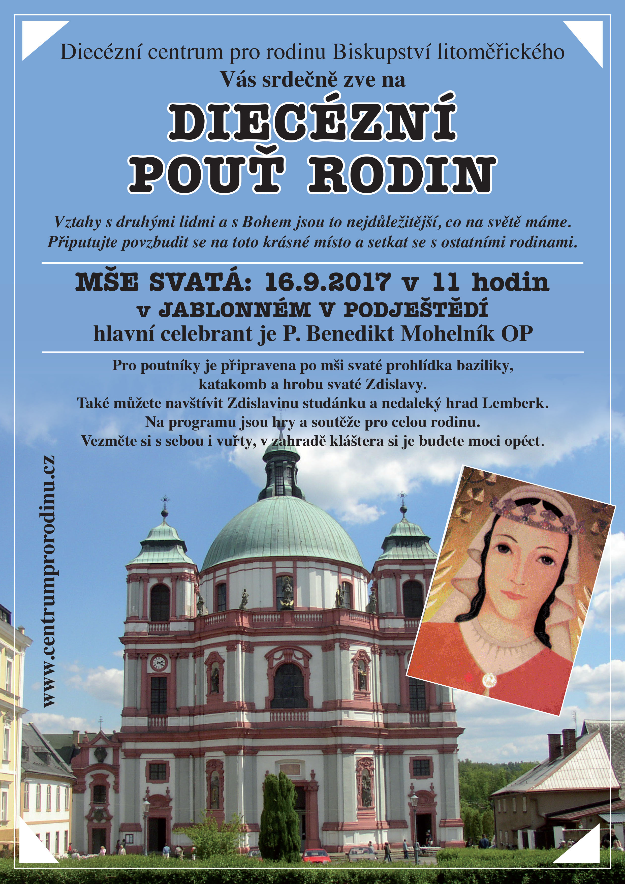 Centrum pro rodinu vás zve na diecézní pouť rodin ke sv. Zdislavě do Jablonného v Podještědí. Koná se 16. září 2017 od 11 hodin.