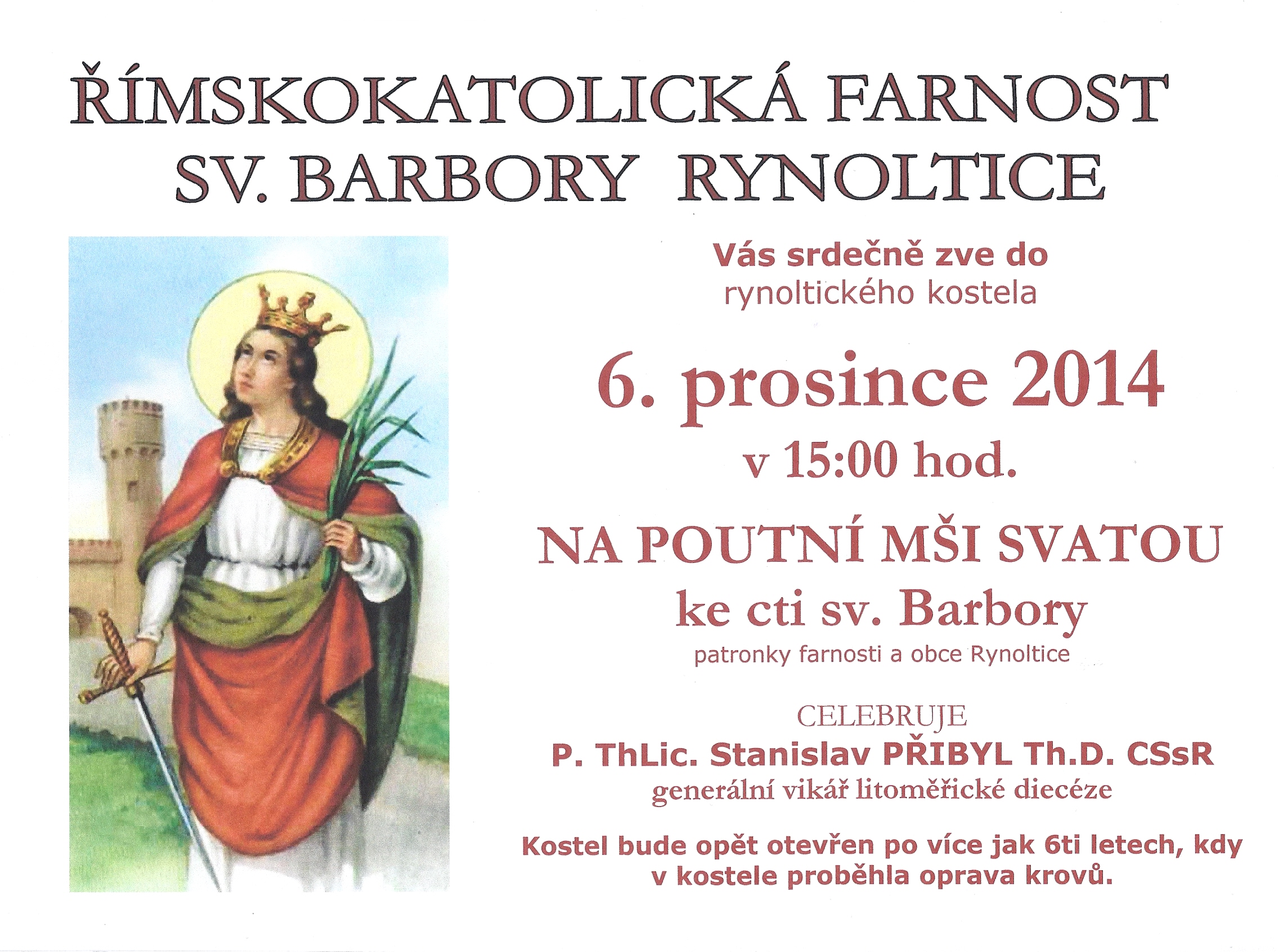 Kostel v Rynolticích bude po šesti letech, kdy zde probíhala oprava krovů, opět otevřen. Zveme vás na poutní mši, která v něm bude ke cti sv. Barbory, patronky farnosti a obce, slavena. Jejím hlavním celebrantem bude generální vikář litoměřické diecéze P. Stanislav Přibyl.